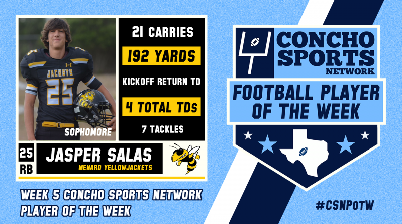 Congratulations to Menard Yellowjackets sophomore running back Jasper Salas on being named the week 5 Concho Sports Network Player of